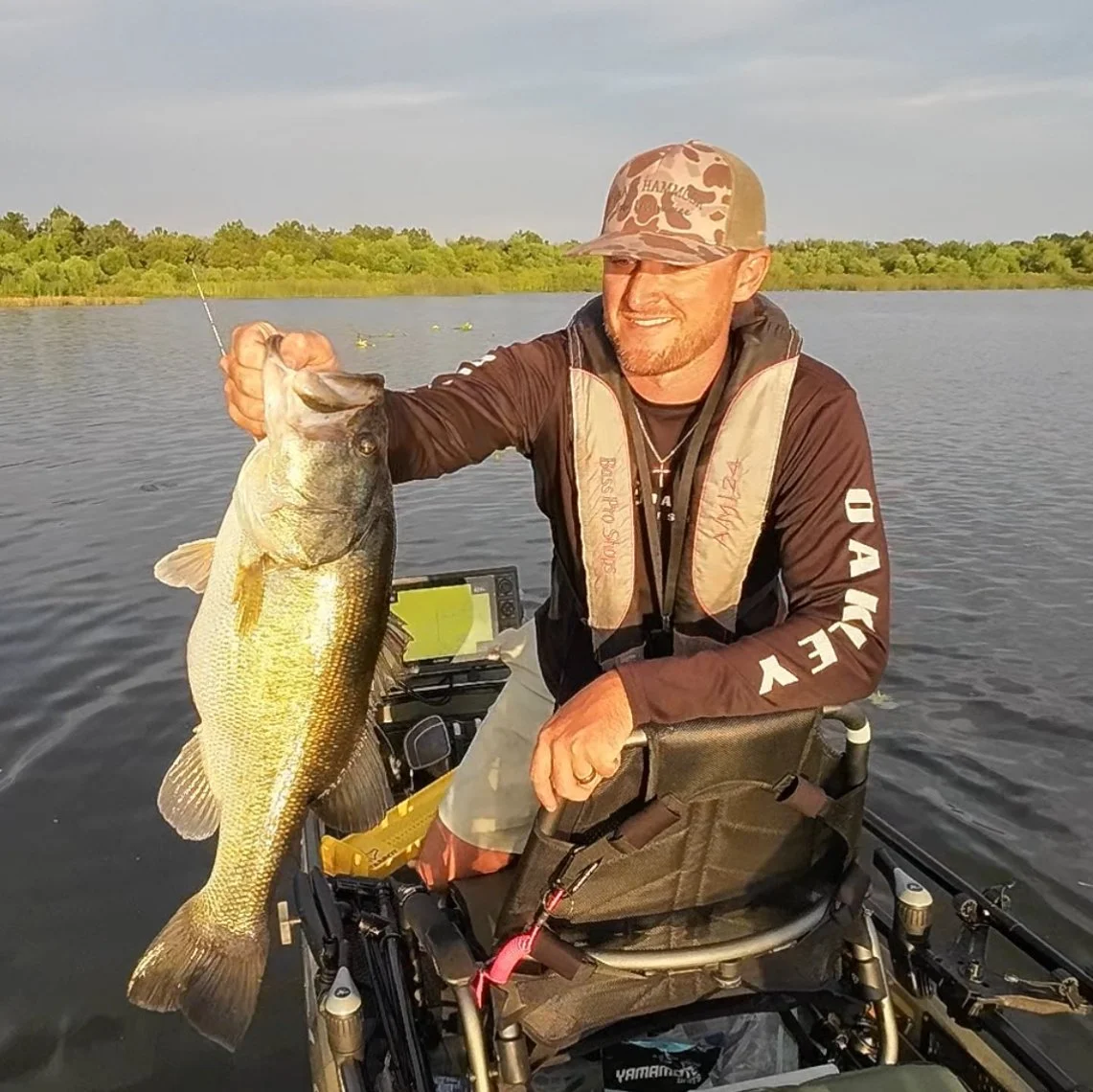 A man in a wheelchair on a boat holding a large fish he caught, with a body of water and green trees in the background.