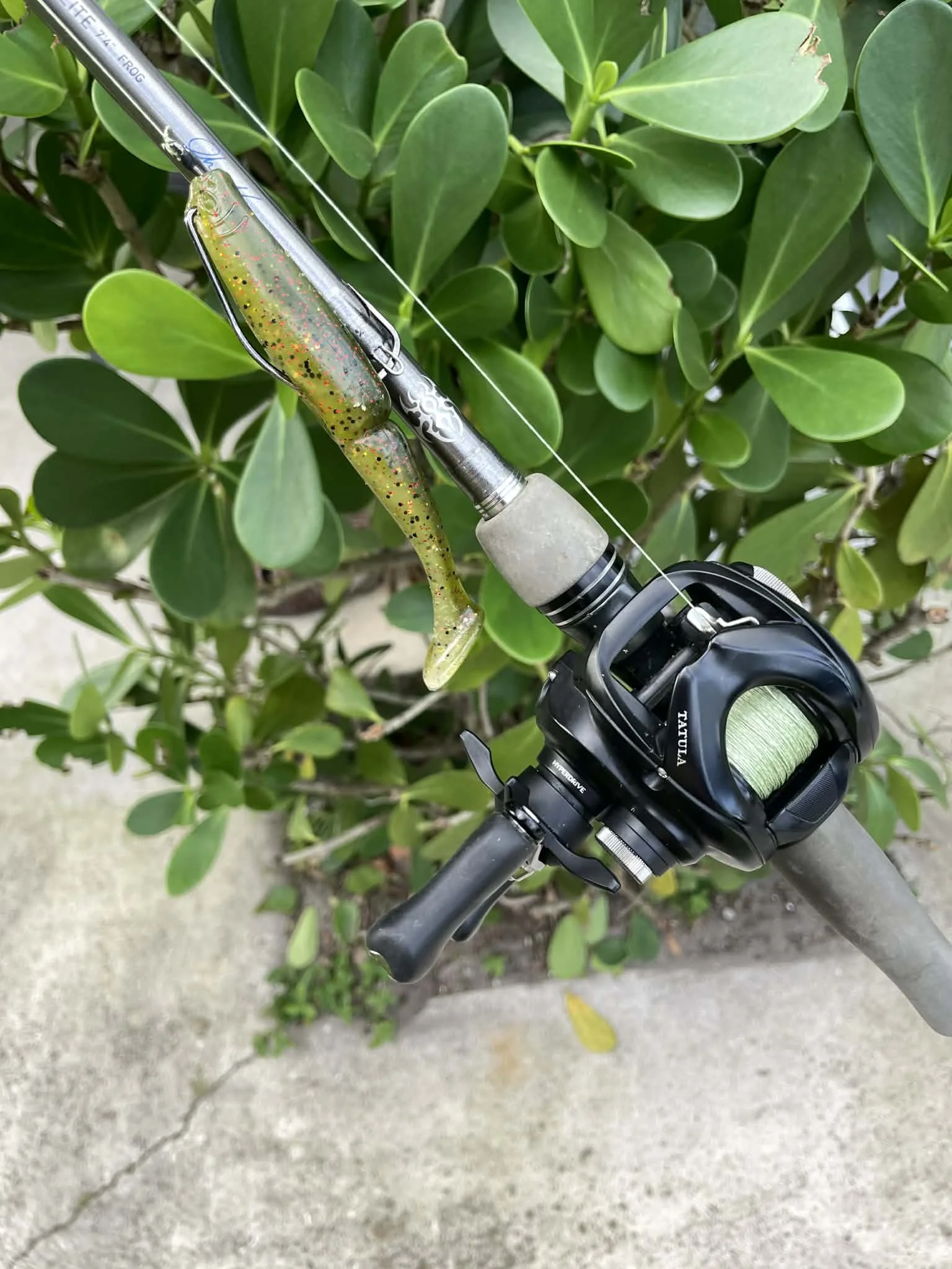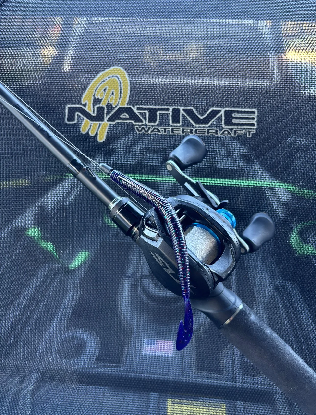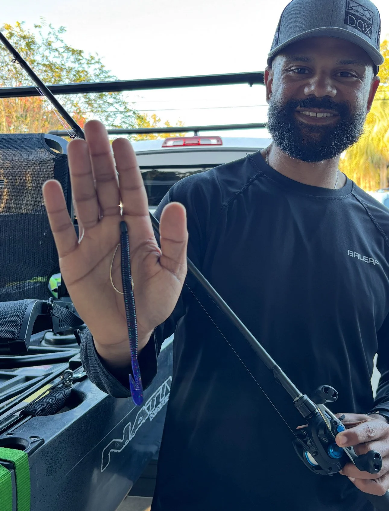 Eric caught all his fish on a Speedworm, rotating between Junebug and Junebug Red. He relied on a 13 Fishing Muse medium-heavy paired with a Shimano SLX spooled with 16 lb fluorocarbon, giving him the power to drive hooks home and pull fish out of the grass when needed. He started the morning swimming the worm across a grass flat to put together an early limit, then shifted to targeting the outside edges of grass mats along a channel, which produced his better-quality fish as the day progressed.
